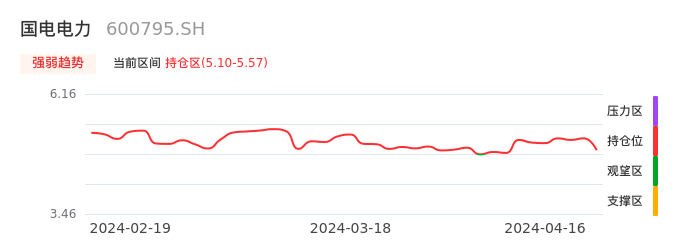 我们来看一下该股的九方特色指标强弱趋势的情况:国电电力自04月02日从观望区上穿到持仓区。股价近期在多头区域回调整理。后续重点关注多空分界点的争夺:5.10元。如未能有效站稳则可能重新回到空头行情。