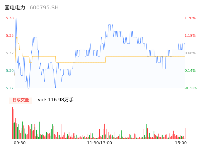 04月15日,国电电力收报5.34,股价涨幅0.95%,成交金额6.23亿元,换手率0.66%。
