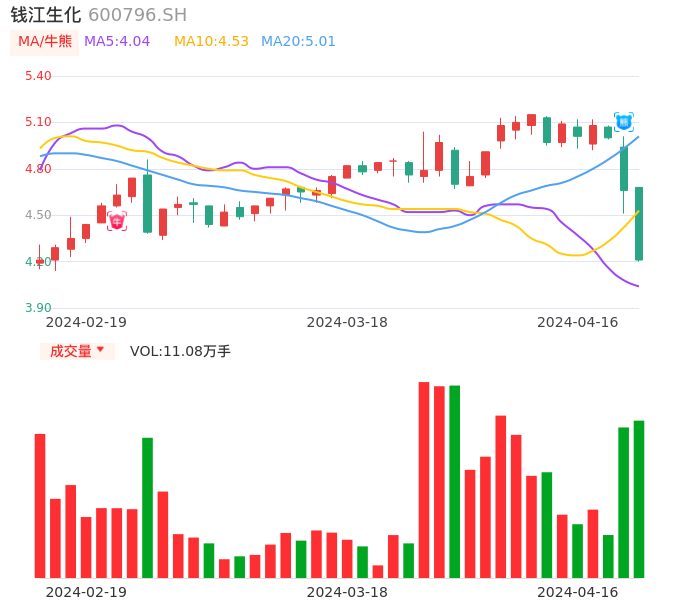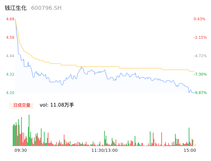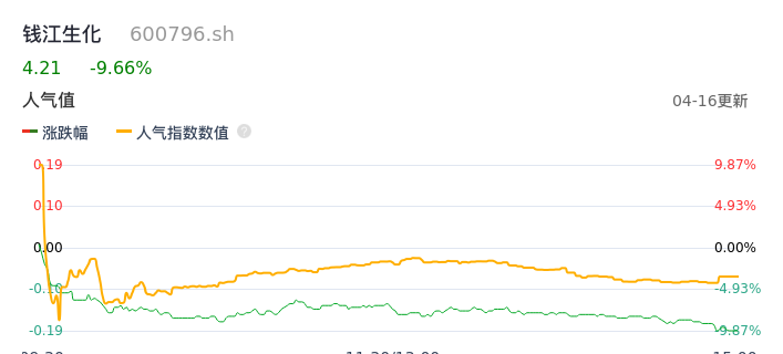 04月16日,钱江生化收报4.21,股价涨幅-9.66%,成交金额4808.43万元,换手率3.68%。
