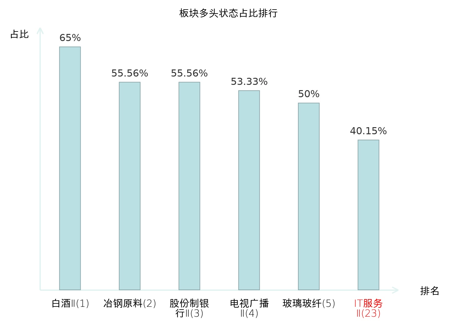 全市场所有行业板块中主力多头状态占比排名中,白酒Ⅱ板块位居第一。白酒Ⅱ板块名次提升最快,较昨日上升71位。