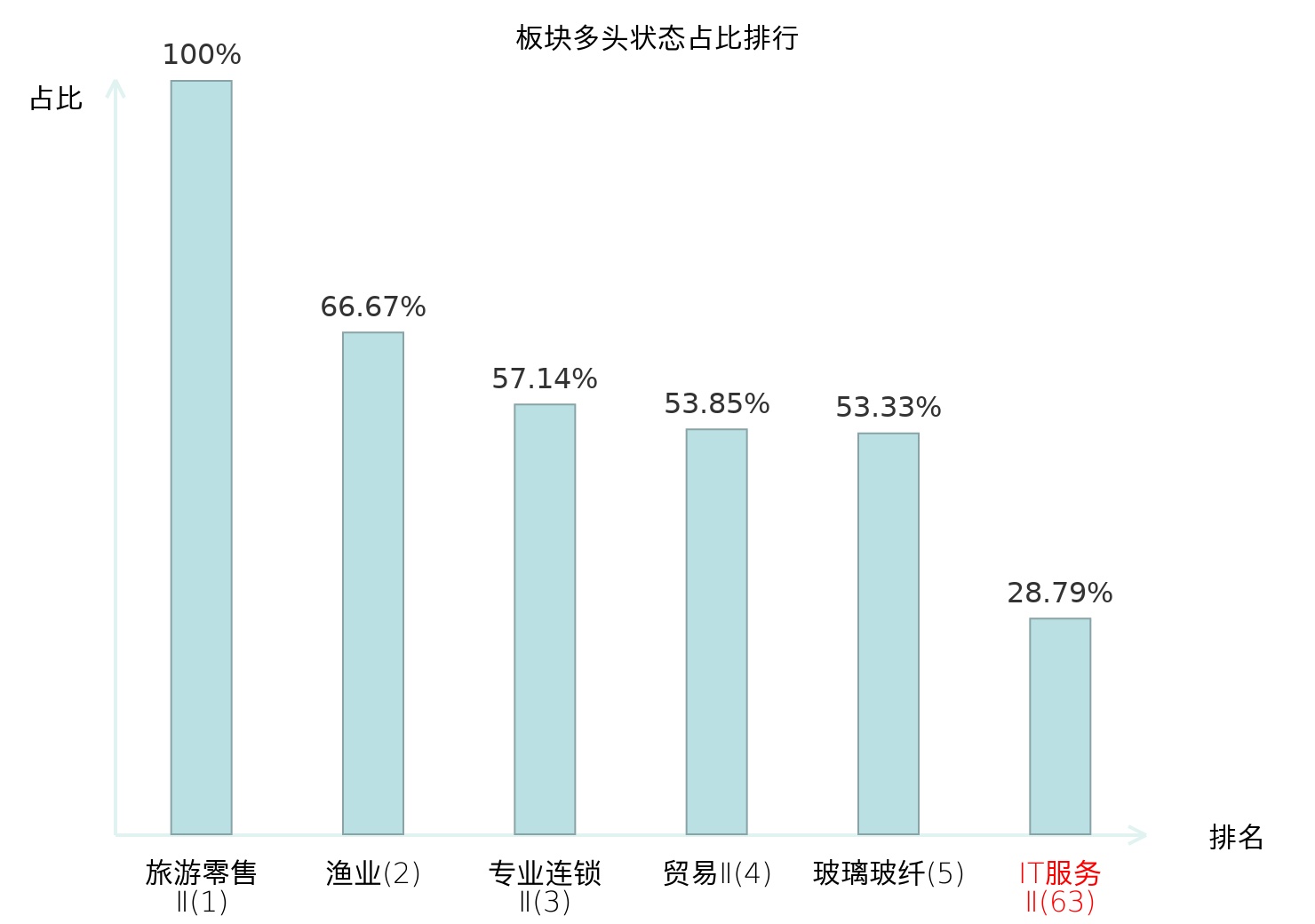 全市场所有行业板块中主力多头状态占比排名中,旅游零售Ⅱ板块位居第一。农业综合Ⅱ板块名次提升最快,较昨日上升83位。