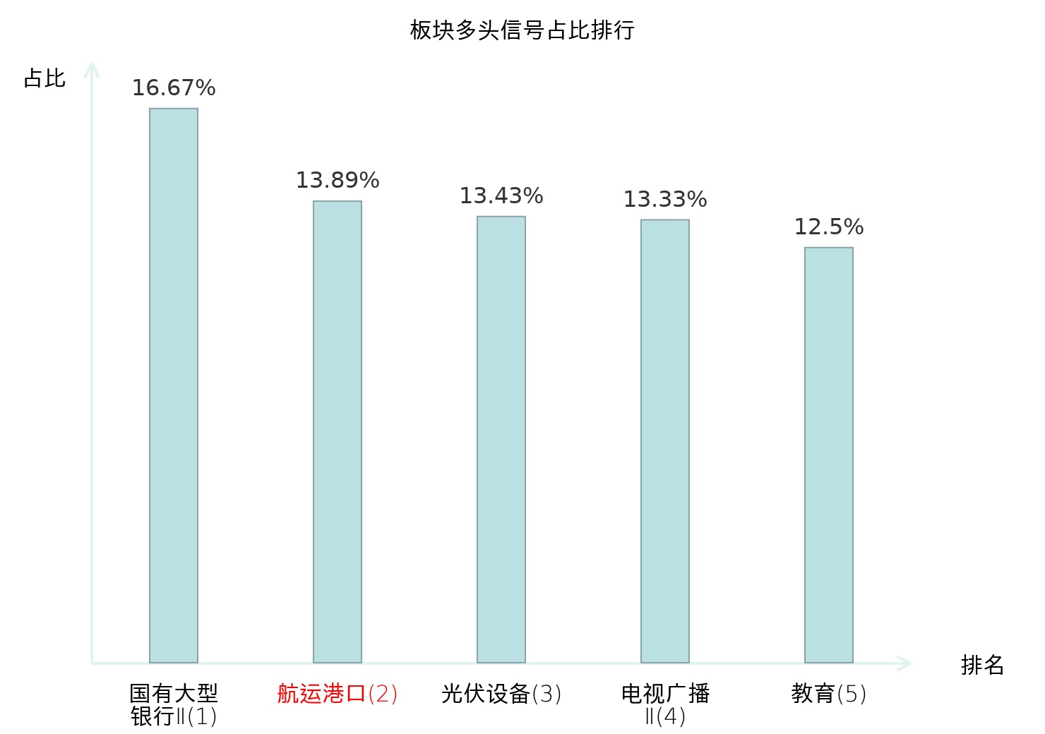 全市场所有行业板块中主力多头信号占比排名中,国有大型银行Ⅱ板块位居第一。国有大型银行Ⅱ板块名次提升最快,较昨日上升124位。
