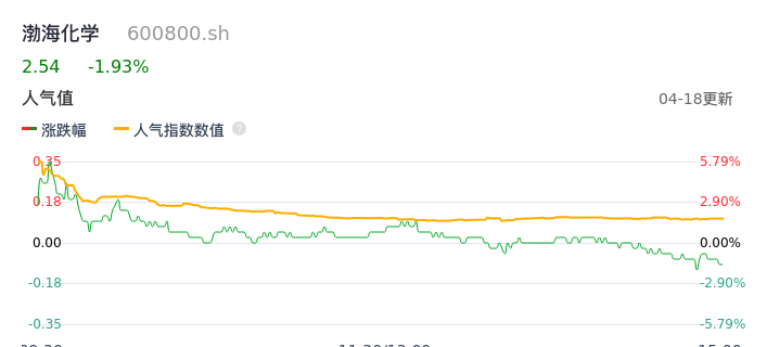 04月18日,渤海化学收报2.54,股价涨幅-1.93%,成交金额6836.56万元,换手率2.33%。