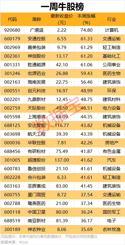 一周牛熊股出炉:领涨股累计涨幅超74%