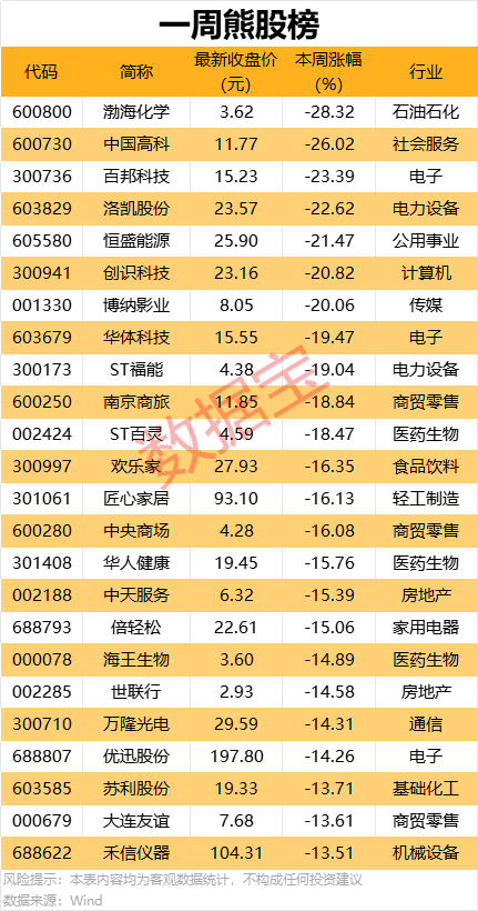 本周累计下跌的个股中,53股跌幅在10%以上,渤海化学一周累计跌28.32%,居首;中国高科、百邦科技、洛凯股份等个股累计跌幅均超20%。