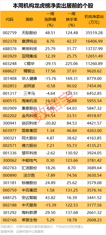 其中,净卖出金额最多的是天际股份,达3.55亿元,本周累计上涨48.51%,一周换手率为124.48%,因日振幅值达16.82%、日涨幅偏离值达8.96%、日涨幅偏离值达10.02%等3次上榜龙虎榜;买卖居前营业部中机构合计净卖出3.55亿元,同时上榜的还有深股通专用席位,净买入1.38亿元,营业部席位一周合计净买入7.38亿元。