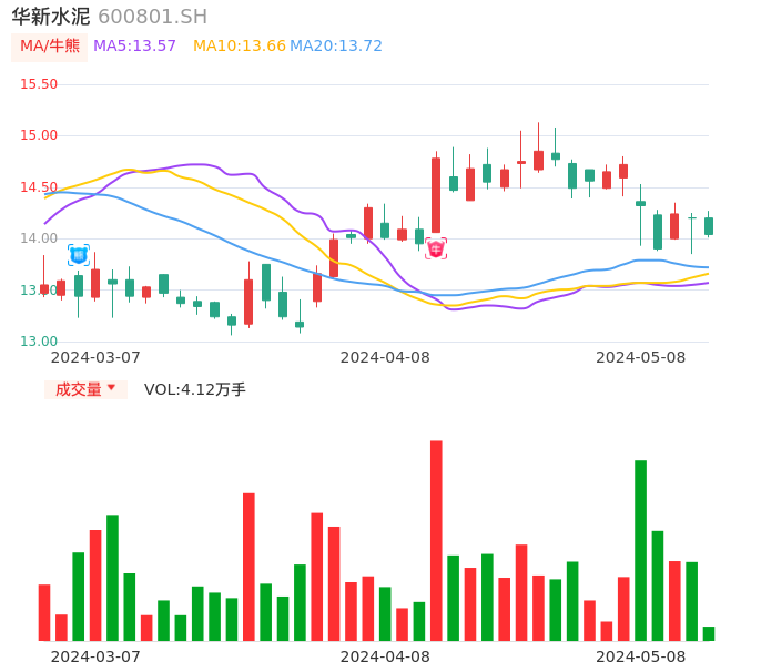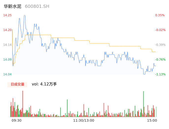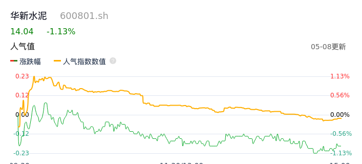 05月08日,华新水泥收报14.04,股价涨幅-1.13%,成交金额5815.83万元,换手率0.31%。