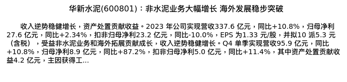 值得注意的是:2024年04月国信证券的任鹤/陈颖分析师,首次发布关于华新水泥的研究报告,标题为:华新水泥(600801):非水泥业务大幅增长 海外发展稳步突破。