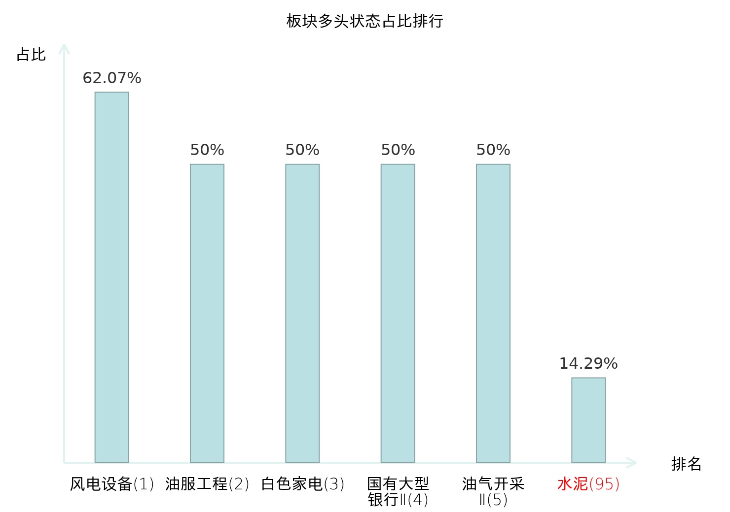 全市场所有行业板块中主力多头状态占比排名中,风电设备板块位居第一。动物保健Ⅱ板块名次提升最快,较昨日上升64位。