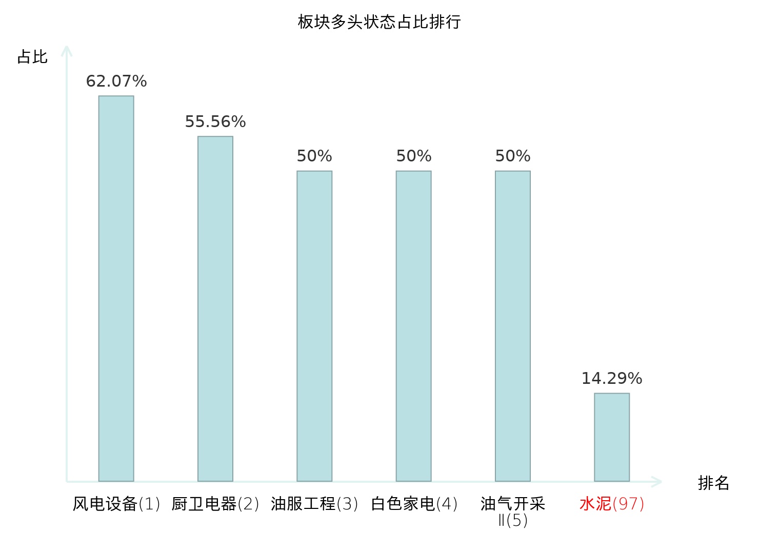 全市场所有行业板块中主力多头状态占比排名中,风电设备板块位居第一。专业连锁Ⅱ板块名次提升最快,较昨日上升65位。