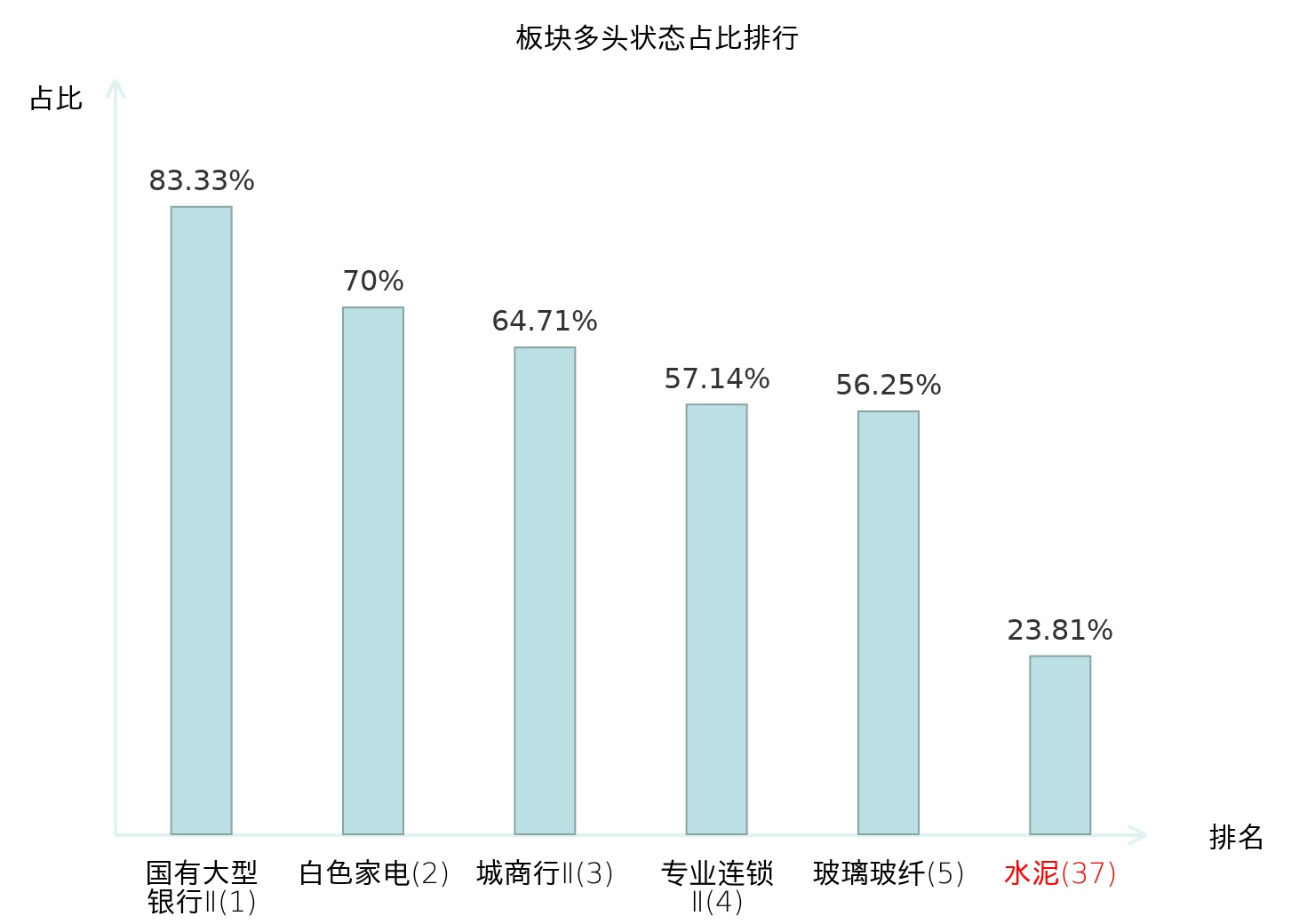全市场所有行业板块中主力多头状态占比排名中,国有大型银行Ⅱ板块位居第一。食品加工板块名次提升最快,较昨日上升51位。