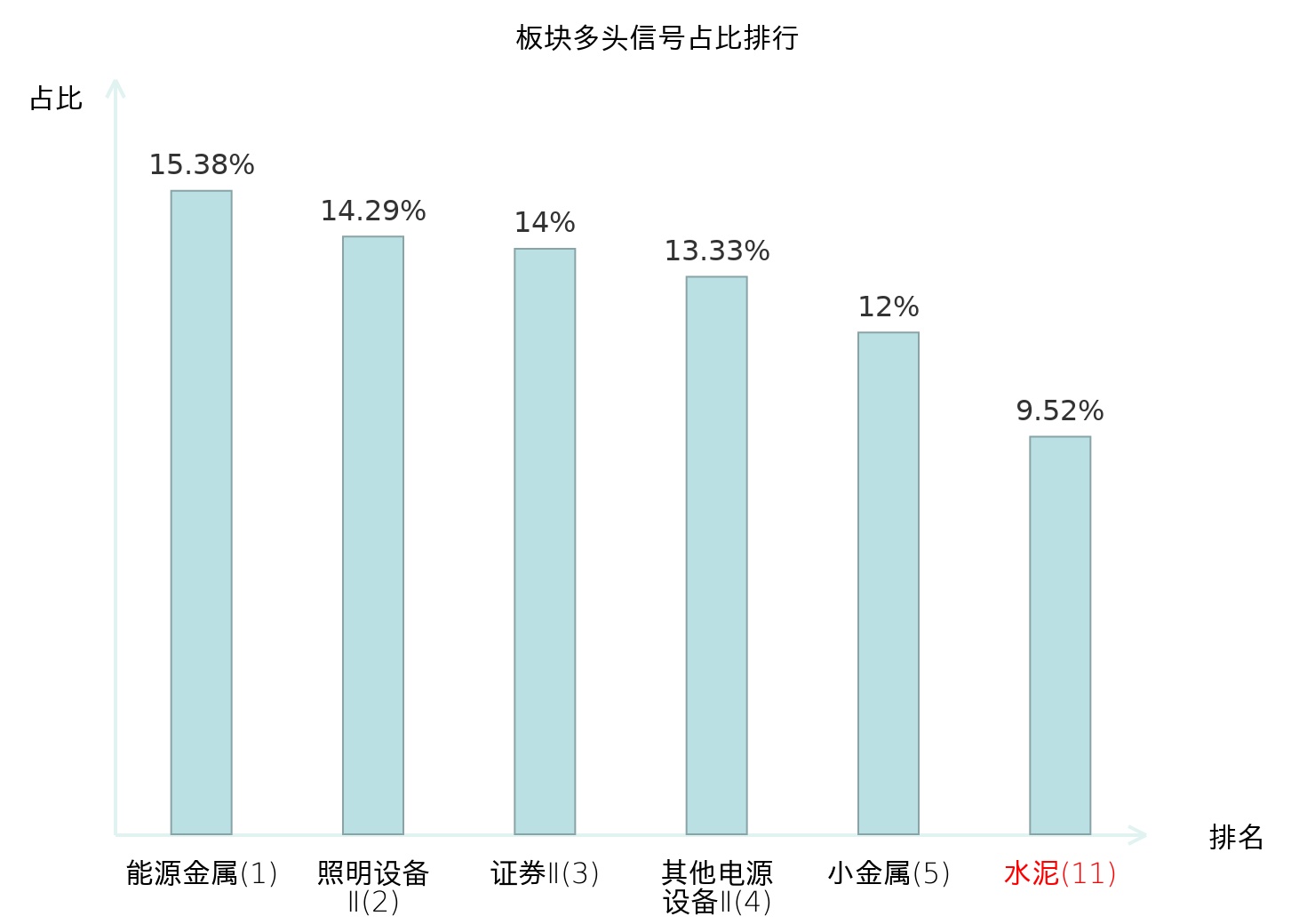 全市场所有行业板块中主力多头信号占比排名中,能源金属板块位居第一。贵金属板块名次提升最快,较昨日上升101位。