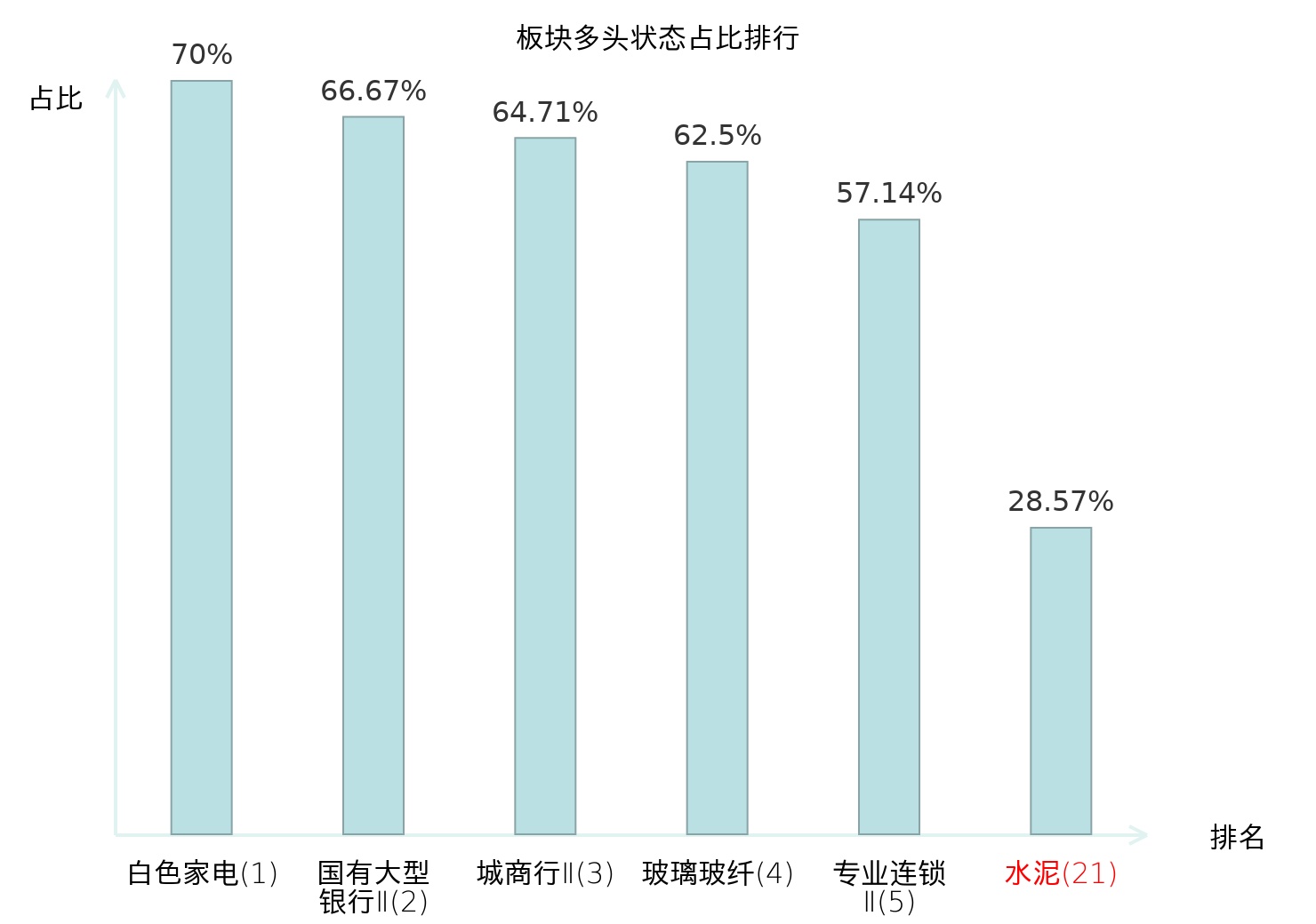 全市场所有行业板块中主力多头状态占比排名中,白色家电板块位居第一。油气开采Ⅱ板块名次提升最快,较昨日上升96位。