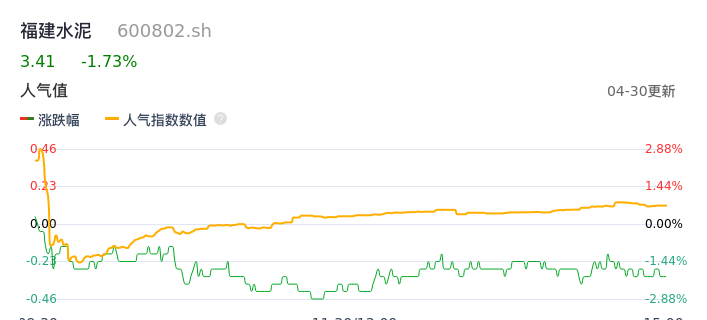 04月30日,福建水泥收报3.41,股价涨幅-1.73%,成交金额2531.11万元,换手率1.62%。