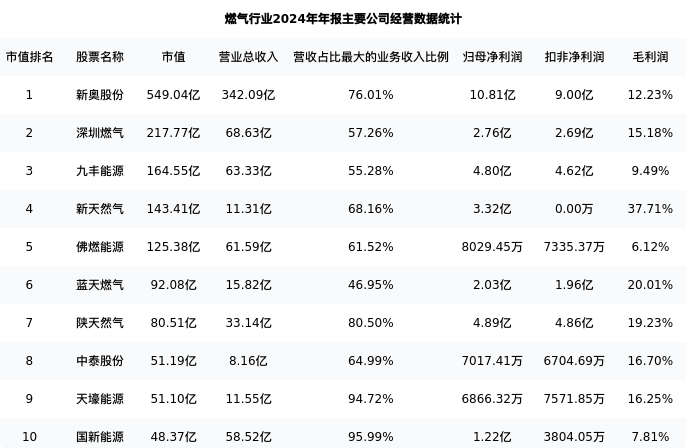 新奥股份最新报告期数据为年报,下表汇总了燃气行业内市值靠前的公司年报主要经营数据