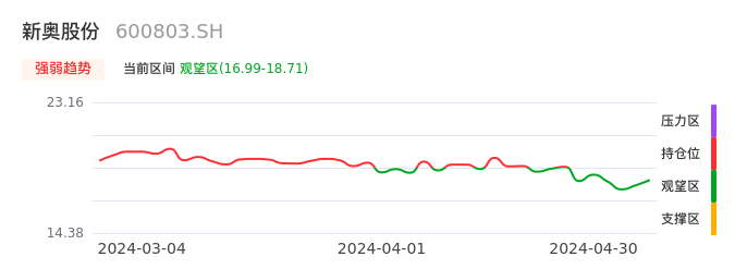 我们来看一下该股的九方特色指标强弱趋势的情况:新奥股份自04月23日从持仓区下穿到观望区。股价近期持续下跌后,短期出现止跌迹象。后续重点关注能否再次站上多空分界点:18.71元。如未能有效突破则可能进入新一轮空头行情。