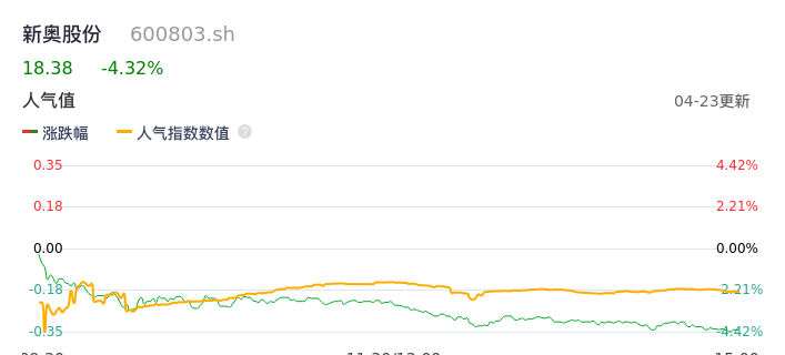 04月23日,新奥股份收报18.38,股价涨幅-4.32%,成交金额2.60亿元,换手率0.49%。