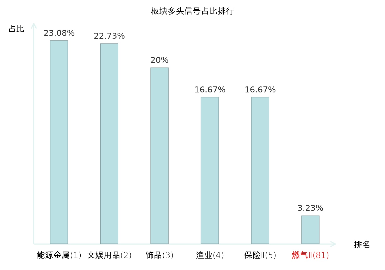 全市场所有行业板块中主力多头信号占比排名中,能源金属板块位居第一。保险Ⅱ板块名次提升最快,较昨日上升120位。