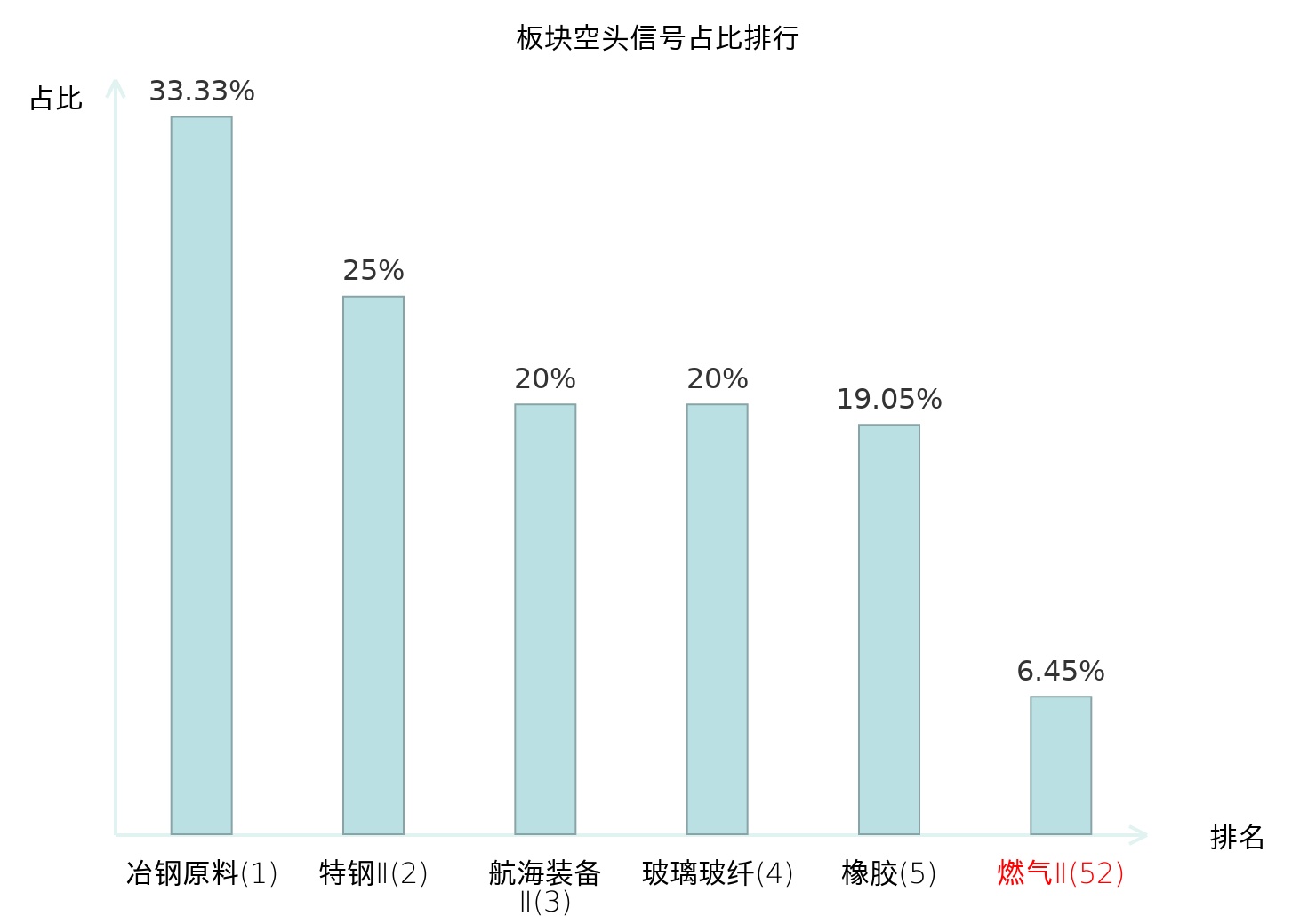 全市场所有行业板块中主力空头信号占比排名中,冶钢原料板块位居第一。军工电子Ⅱ板块名次提升最快,较昨日上升98位。