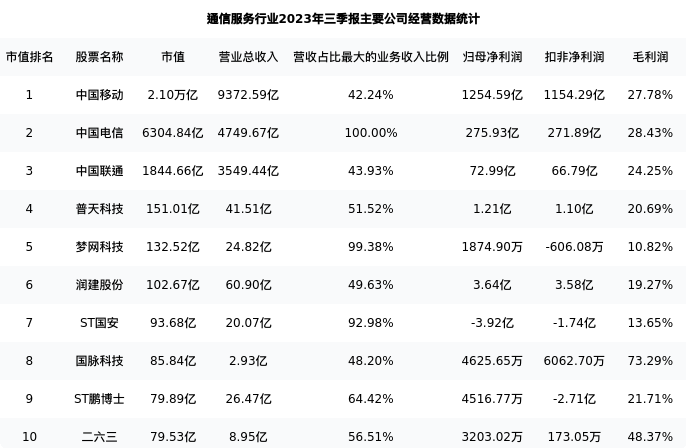 ST鹏博士最新报告期数据为三季报,下表汇总了通信服务行业内市值靠前的公司三季报主要经营数据