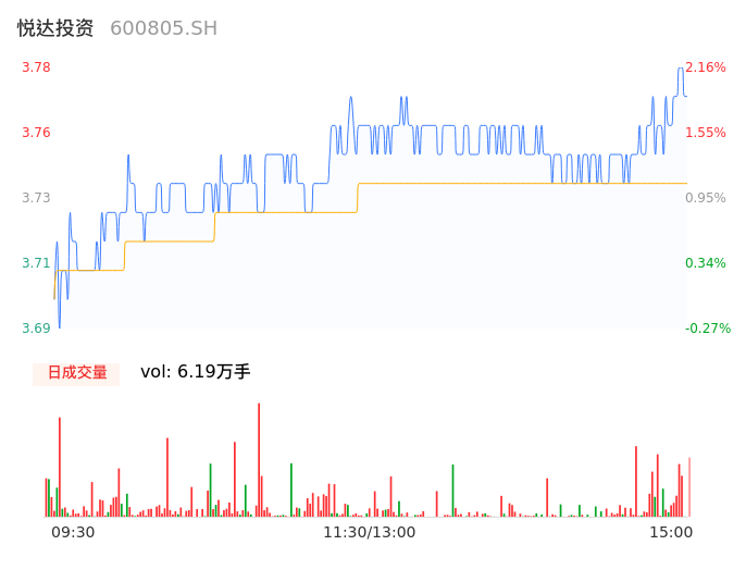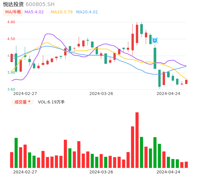 04月24日,悦达投资收报3.77,股价涨幅1.89%,成交金额2315.51万元,换手率0.73%。