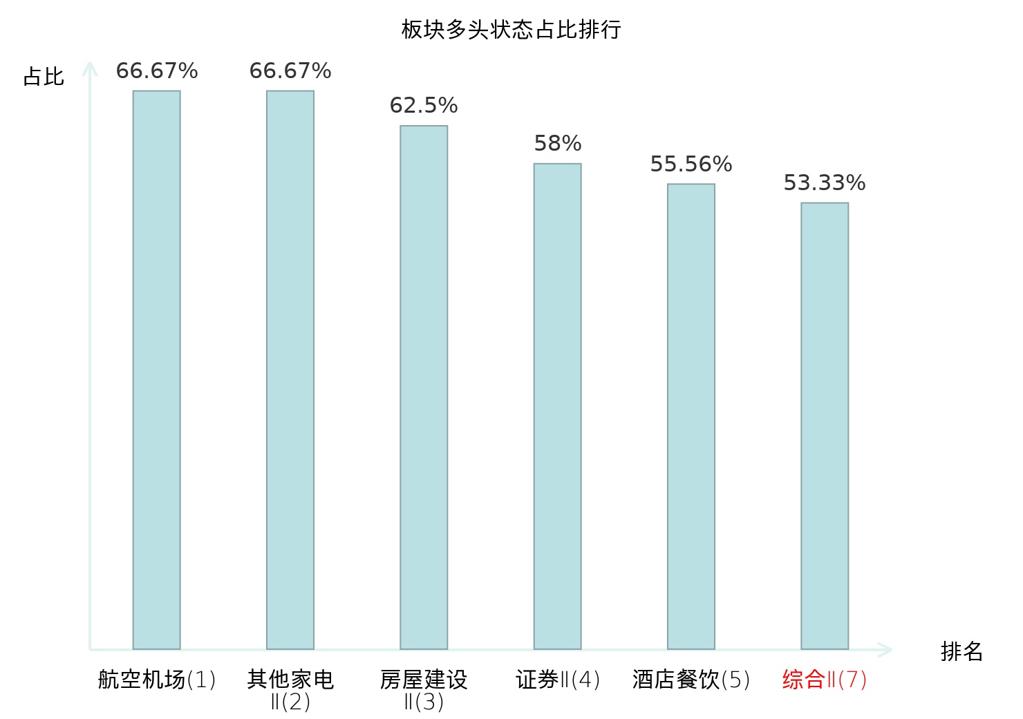 全市场所有行业板块中主力多头状态占比排名中,航空机场板块位居第一。装修建材板块名次提升最快,较昨日上升62位。