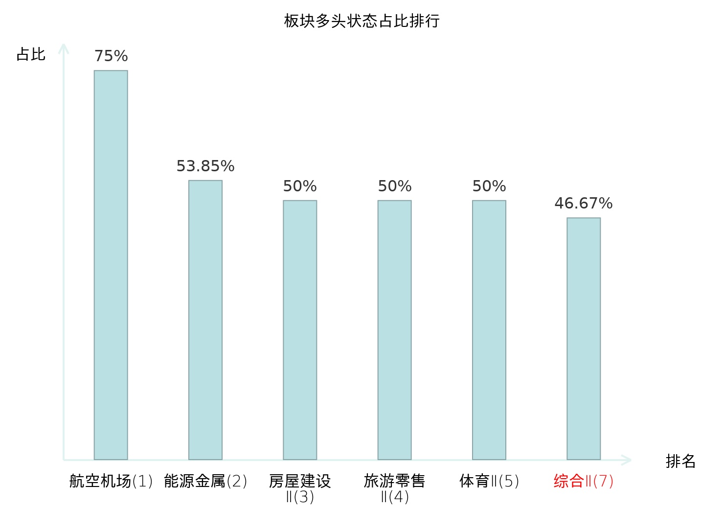 全市场所有行业板块中主力多头状态占比排名中,航空机场板块位居第一。其他电子Ⅱ板块名次提升最快,较昨日上升53位。