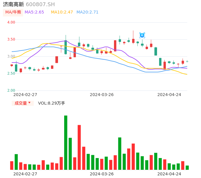 04月24日,济南高新收报2.85,股价涨幅-0.70%,成交金额2354.75万元,换手率1.05%。