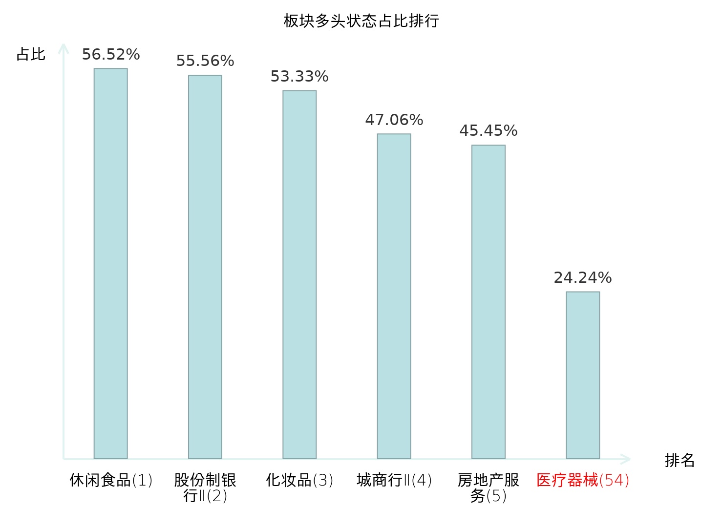 全市场所有行业板块中主力多头状态占比排名中,休闲食品板块位居第一。汽车服务板块名次提升最快,较昨日上升90位。