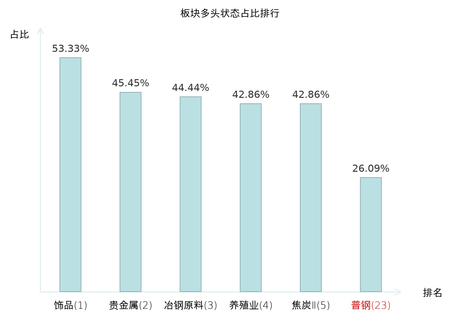 全市场所有行业板块中主力多头状态占比排名中,饰品板块位居第一。非金属材料Ⅱ板块名次提升最快,较昨日上升58位。