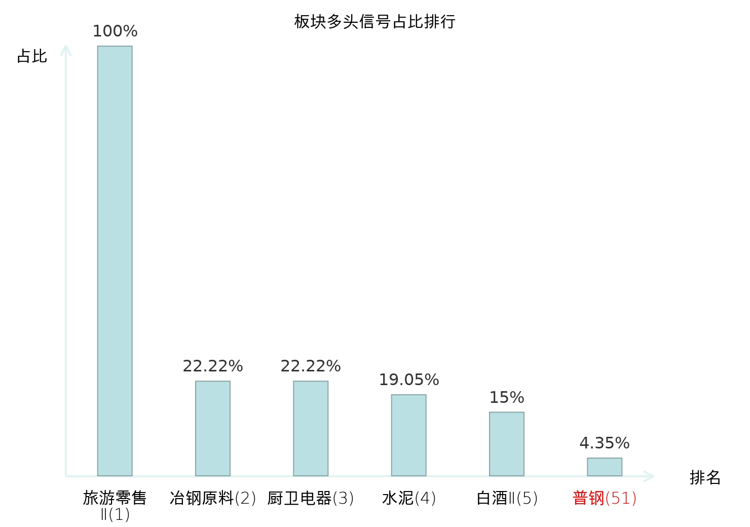 全市场所有行业板块中主力多头信号占比排名中,旅游零售Ⅱ板块位居第一。旅游零售Ⅱ板块名次提升最快,较昨日上升130位。