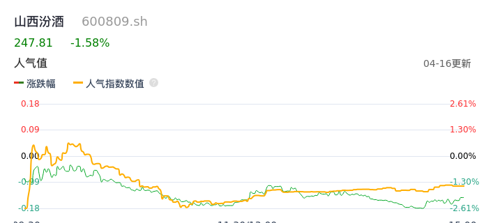 04月16日,山西汾酒收报247.81,股价涨幅-1.58%,成交金额8.84亿元,换手率0.29%。