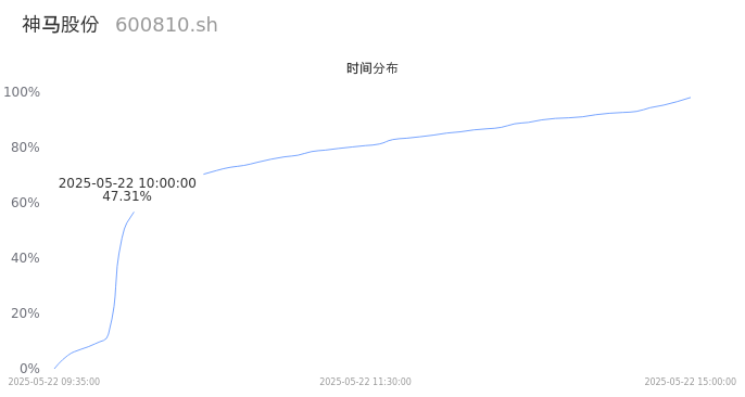 首先我们来看当日成交的时间分布。将今日交易时间按照5分钟的时间间隔进行切片,并绘制分布直方图进行观察。可以发现,10点之前的成交量占全天成交量的47.31%,这说明,该股票活跃时段换手火爆,资金热情高涨。