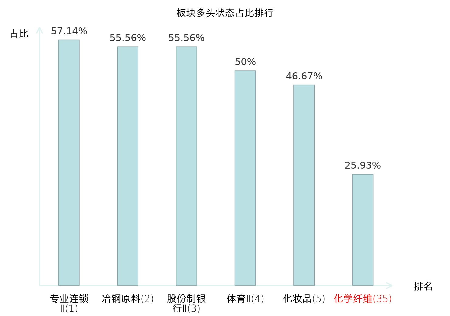 全市场所有行业板块中主力多头状态占比排名中,专业连锁Ⅱ板块位居第一。乘用车板块名次提升最快,较昨日上升85位。