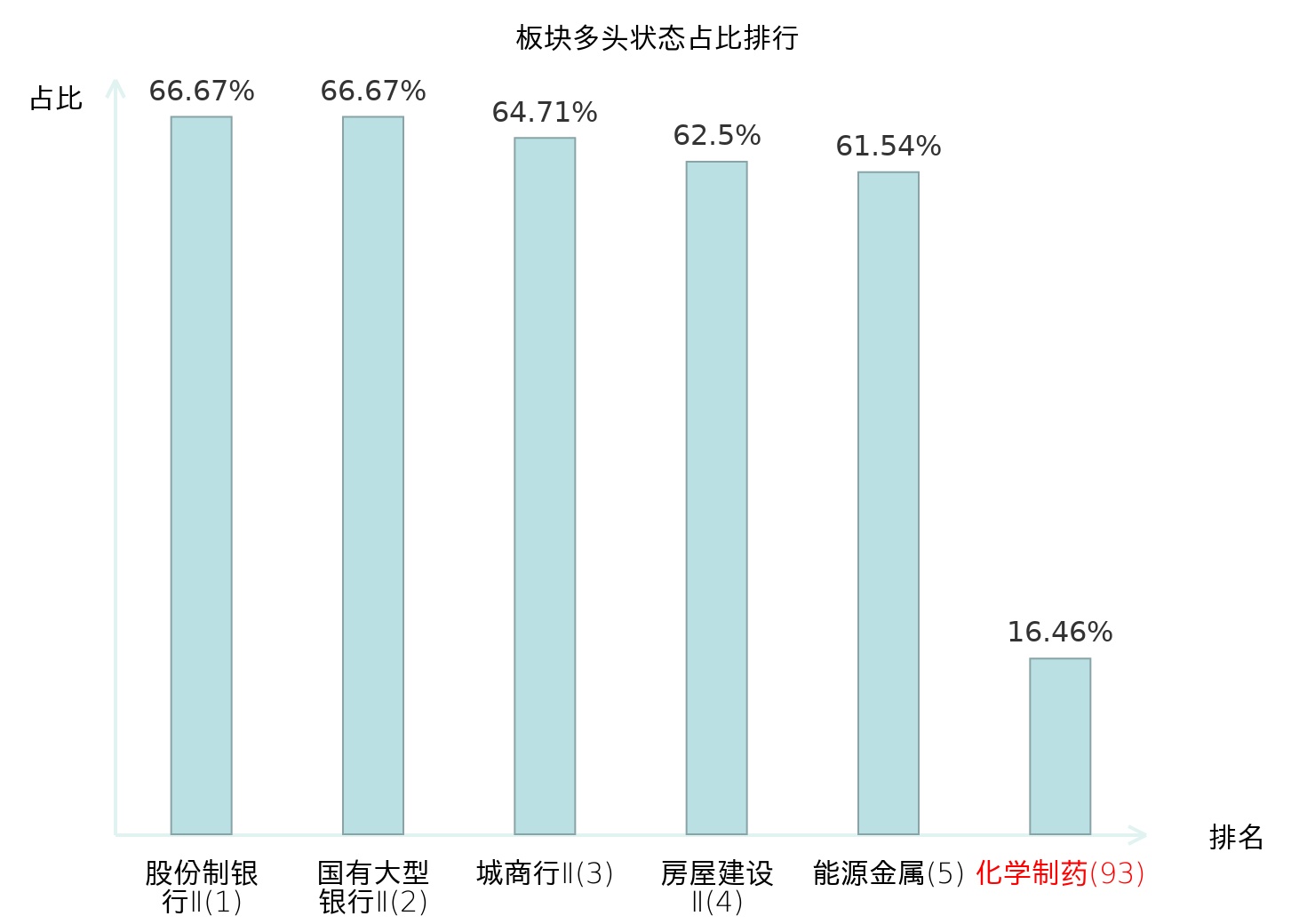 全市场所有行业板块中主力多头状态占比排名中,股份制银行Ⅱ板块位居第一。其他家电Ⅱ板块名次提升最快,较昨日上升102位。