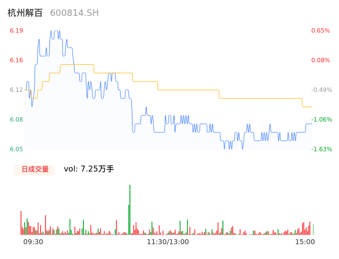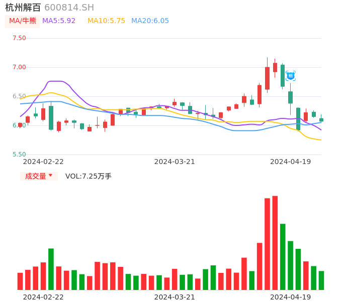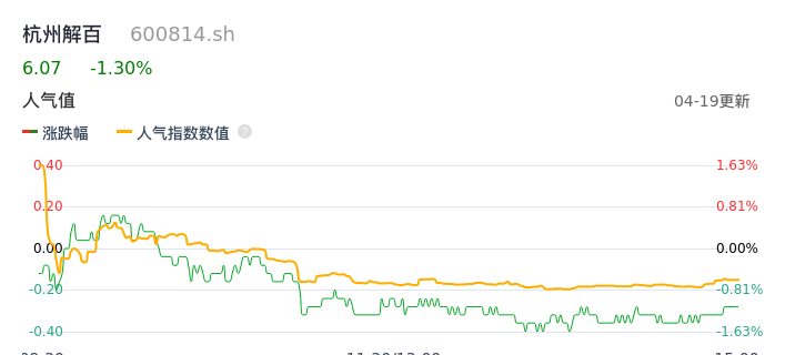 04月19日,杭州解百收报6.07,股价涨幅-1.30%,成交金额4424.87万元,换手率1.00%。