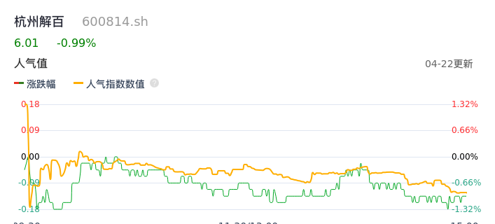 04月22日,杭州解百收报6.01,股价涨幅-0.99%,成交金额3179.39万元,换手率0.73%。