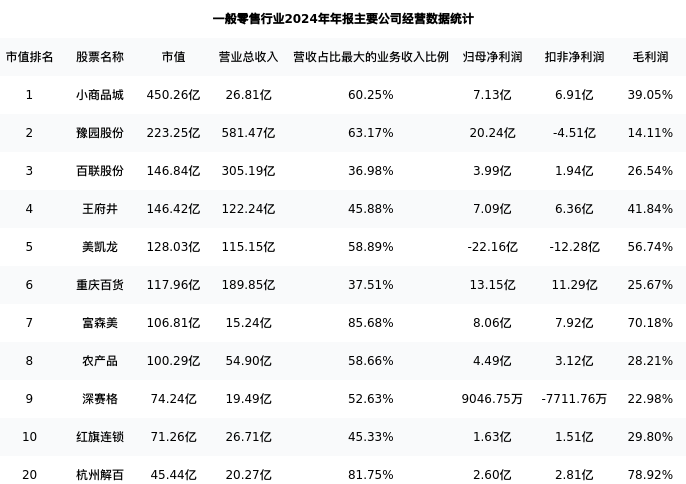 杭州解百最新报告期数据为年报,下表汇总了一般零售行业内市值靠前的公司年报主要经营数据