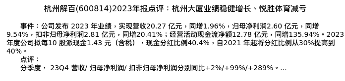 值得注意的是:2024年03月信达证券的刘嘉仁/蔡昕妤分析师,首次发布关于杭州解百的研究报告,标题为:杭州解百(600814)2023年报点评:杭州大厦业绩稳健增长、悦胜体育减亏。