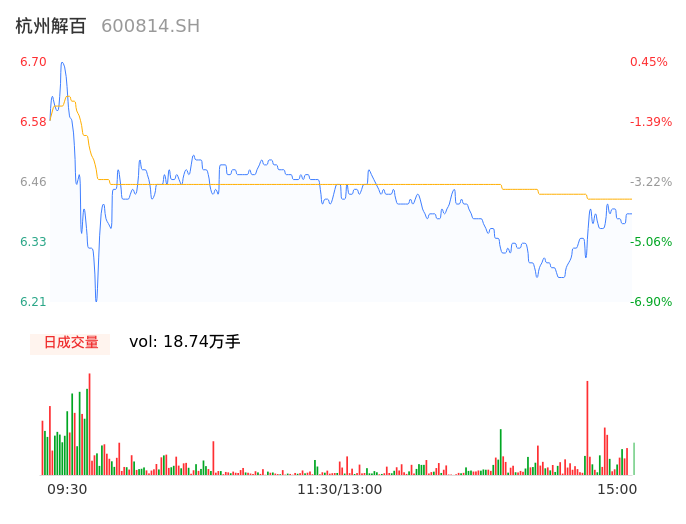 04月15日,杭州解百收报6.38,股价涨幅-4.35%,成交金额1.20亿元,换手率2.59%。