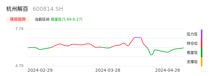 我们来看一下该股的九方特色指标强弱趋势的情况:杭州解百自04月15日从持仓区下穿到观望区。股价近期持续下跌后,短期出现止跌迹象。后续重点关注能否再次站上多空分界点:6.27元。如未能有效突破则可能进入新一轮空头行情。