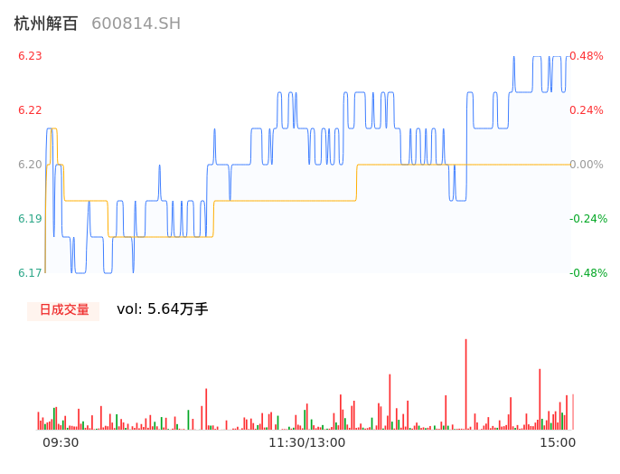 04月26日,杭州解百收报6.23,股价涨幅0.48%,成交金额3496.77万元,换手率0.78%。
