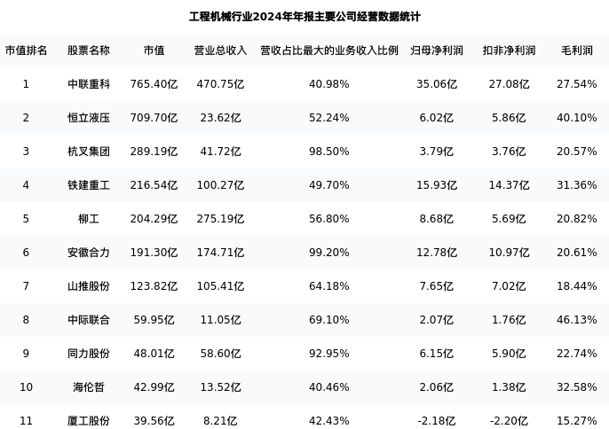 厦工股份最新报告期数据为年报,下表汇总了工程机械行业内市值靠前的公司年报主要经营数据