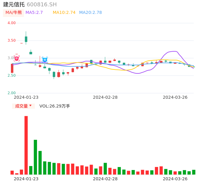 03月26日,建元信托收报2.74,股价涨幅-0.36%,成交金额7241.21万元,换手率0.49%。