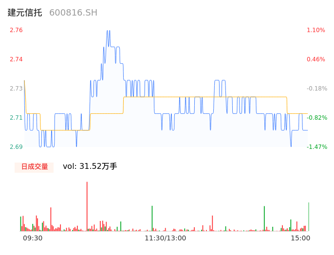 04月12日,建元信托收报2.69,股价涨幅-1.47%,成交金额8548.37万元,换手率0.58%。