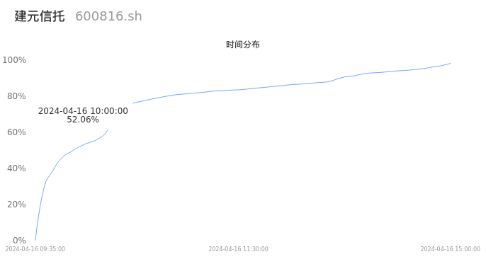 600816建元信托2024年04月16日成交194.38万手,成交金额5.89亿元,相较昨日放量90.40万手,换手率3.55%,成交清淡。