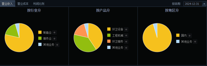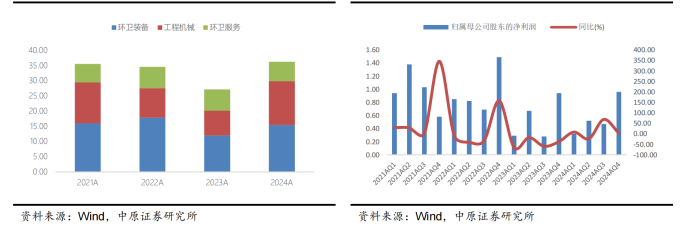 公司主要产品涵盖环卫设备、环卫服务、矿用装备和基础工程机械四大领域。2024年,在行业竞争加剧背景下,公司营业收入和扣非后归母净利润同比增速显著回升,体现出较强的产品竞争力和经营管理能力。分业务来看,环卫装备15.43亿元营业收入,同比增长28.92%;工程机械营业收入14.40亿元,同比增长76.03%;环卫服务营业收入6.42亿元,同比下滑8.18%。公司综合毛利率21.56%,同比下滑5.89个百分点;销售净利率6.70%;同比下滑1.08个百分点。