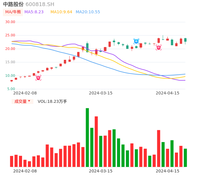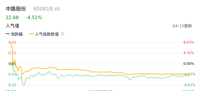 04月15日,中路股份收报22.68,股价涨幅-4.51%,成交金额4.13亿元,换手率7.66%。