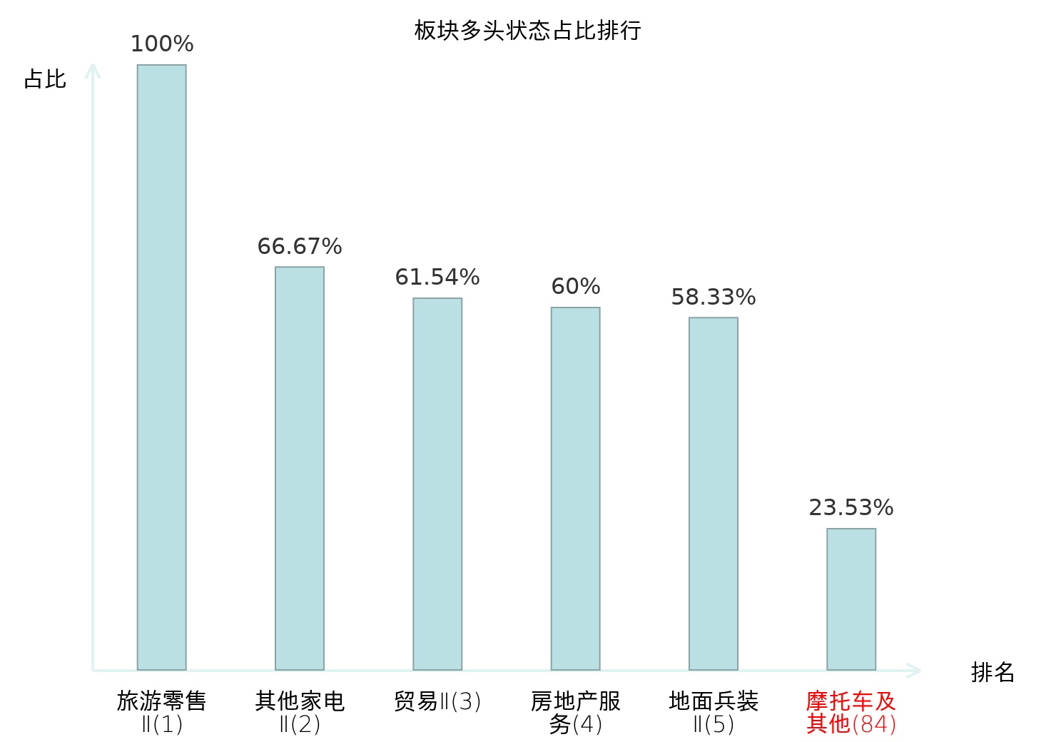 全市场所有行业板块中主力多头状态占比排名中,旅游零售Ⅱ板块位居第一。化妆品板块名次提升最快,较昨日上升62位。