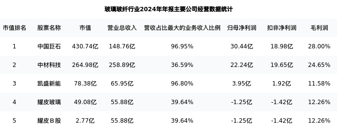 耀皮玻璃最新报告期数据为年报,下表汇总了玻璃玻纤行业内市值靠前的公司年报主要经营数据